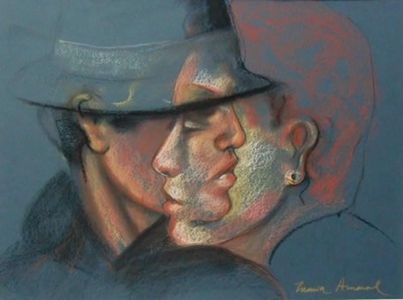 Aqui, la generosidad, la ternura y el cariño de Maria Amaral no tienen limites. Un cuerpo, deja de ser un solo cuerpo y se vuelve varios, se abre, invade el lienzo, el dibujo, el espacio. Ella quiere tanto ese cuerpo humano que lo multiplica, lo mezcla, lo amasa lo despliega para que podamos admirar todos sus recovecos y todos sus destellos. Dos cuerpos que se abrazan son un ramo de caricias, una ola de ternura. El tiempo se esfuma cuando nace el amor.